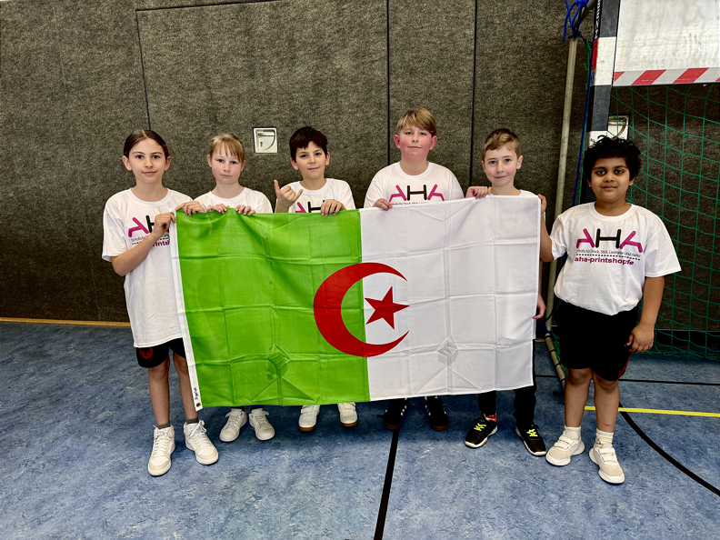 Unsere beiden Mannschaften gingen für Algerien und Schweden an den Start. Passend dazu erhielten die Kinder T-Shirts und liefen bei der feierlichen Turniereröffnung mit einer großen Flagge zur Nationalhymne ein.