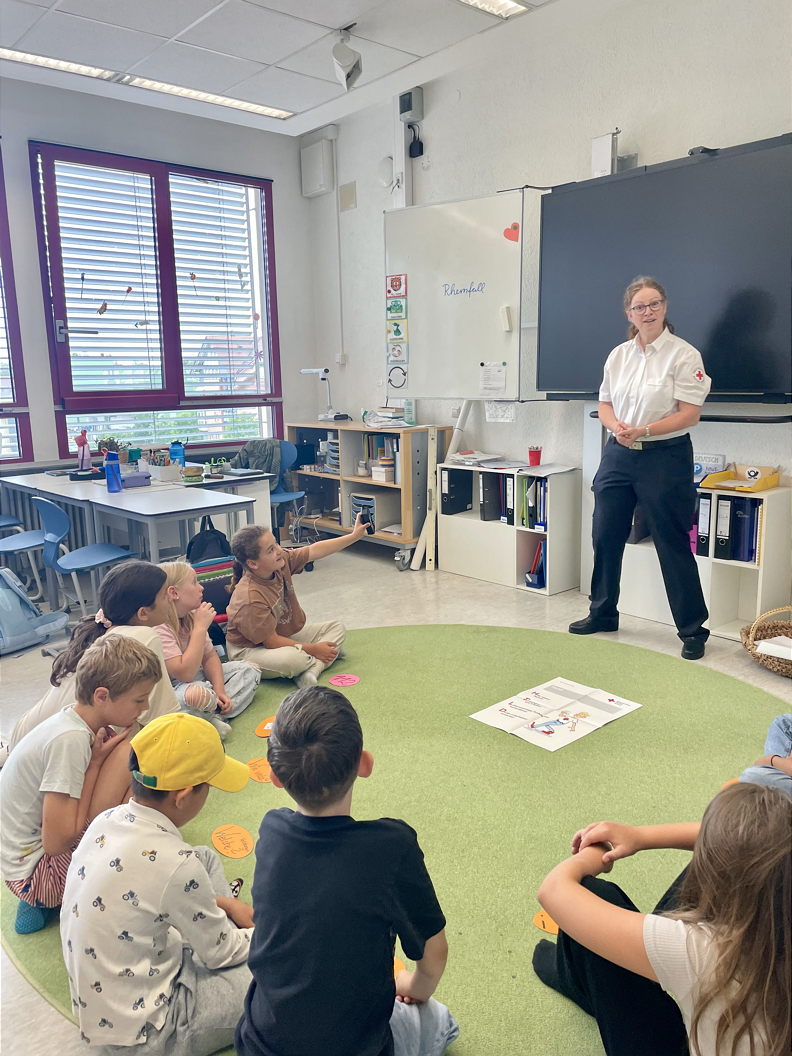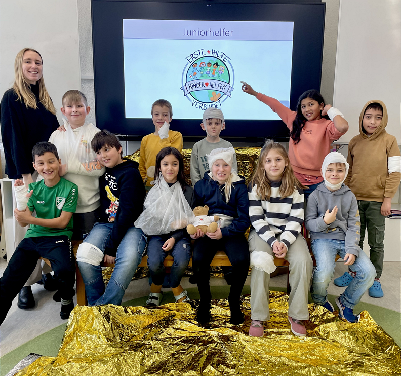 Seit diesem Schuljahr werden an unserer Schule wieder Dritt- und ViertklässlerInnen zu Juniorhelfern ausgebildet. Im Rahmen des Atelierunterrichts erwerben die Juniorhelfer kindgerecht und spielerisch verschiedene theoretische und praktische Erste-Hilfe-Kenntnisse. So lernen die Kinder, wie man einen Notruf absetzt, kleine Wunden versorgt und mit Hitze- und Kälteschäden oder mit Bauchschmerzen umgeht. Aber auch die Versorgung von Kopf- und Sportverletzungen, stärkeren Blutungen sowie das Thema Bewusstlosigkeit werden thematisiert.