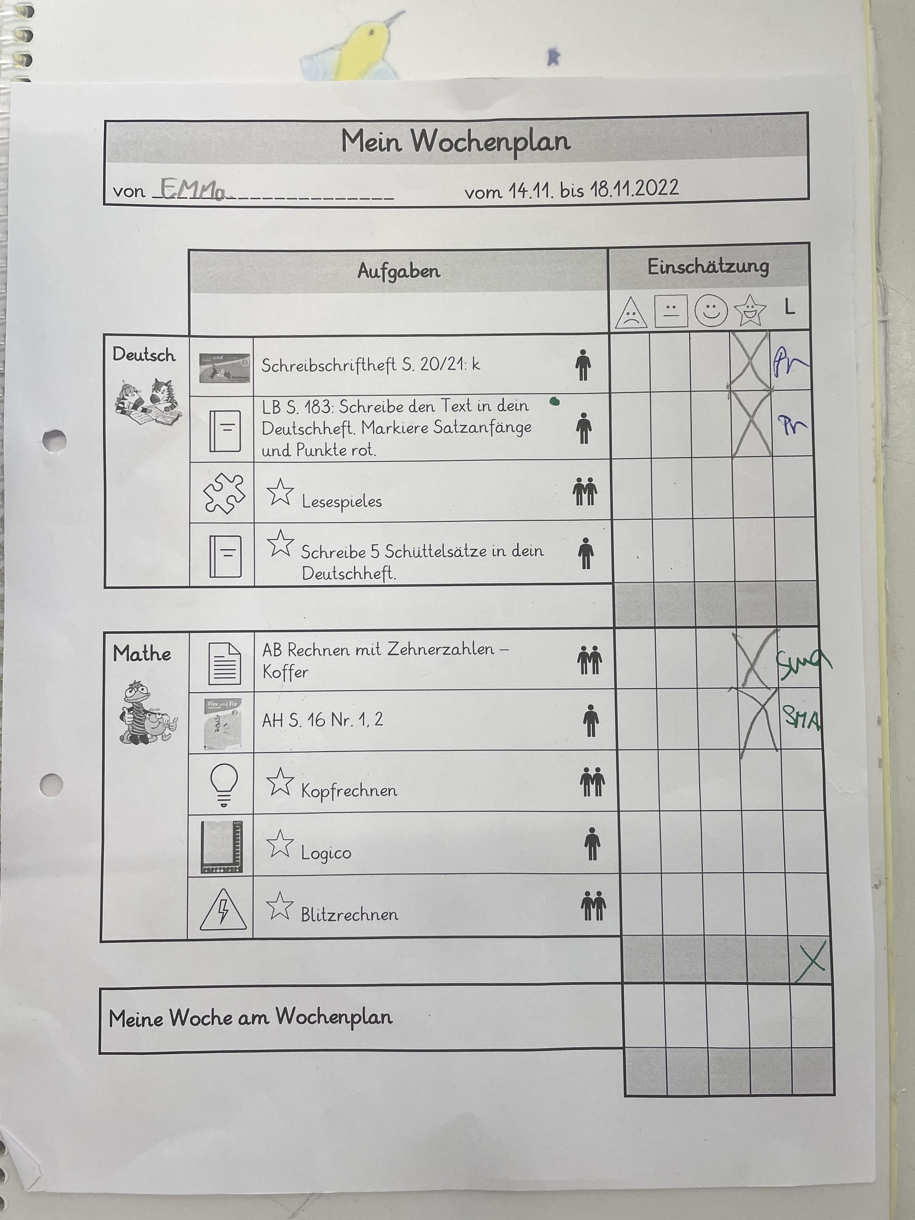 Der Lernplaner ist ein wichtiges Instrument für das selbstorganisiertes Lernen, das wir bereits ab der ersten Klasse einsetzen. Je nach Klassenstufe ist der Lernplaner etwas anders aufgebaut.