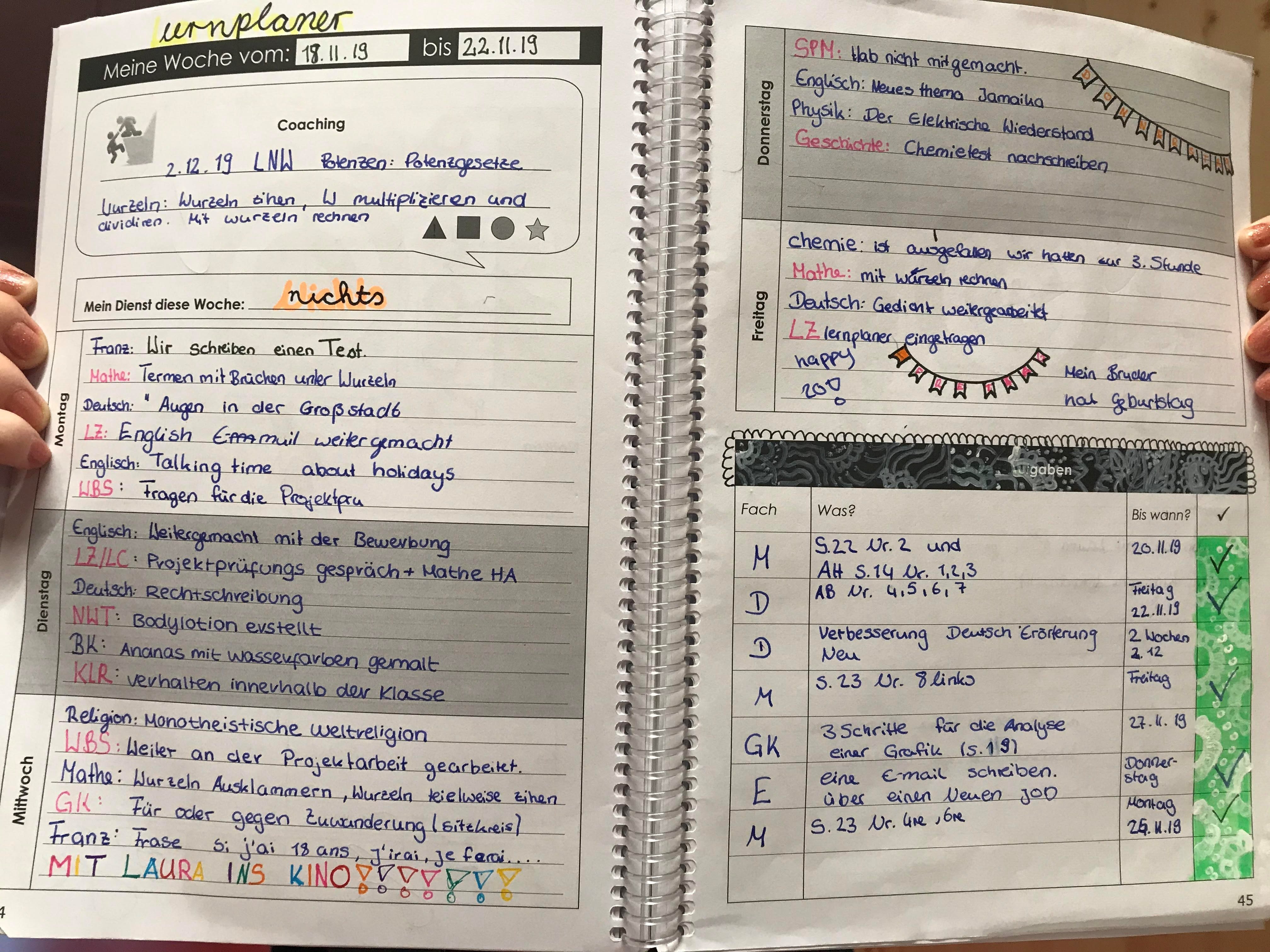 In den Lernplaner schreiben die Schüler*innen ihre Hausaufgaben oder Lernbandaufgaben. Neben der Dokumentation der Coaching-Gespräche in der Sekundarstufe dient der Lernplaner zudem als wichtiges Kommunikationsmittel zwischen Schule und Elternhaus. Die Schüler*innen haben zusätzlich die Möglichkeit sich im Lernplaner Notizen zu machen, Termine einzutragen und ihren Wochenrückblick zu machen.