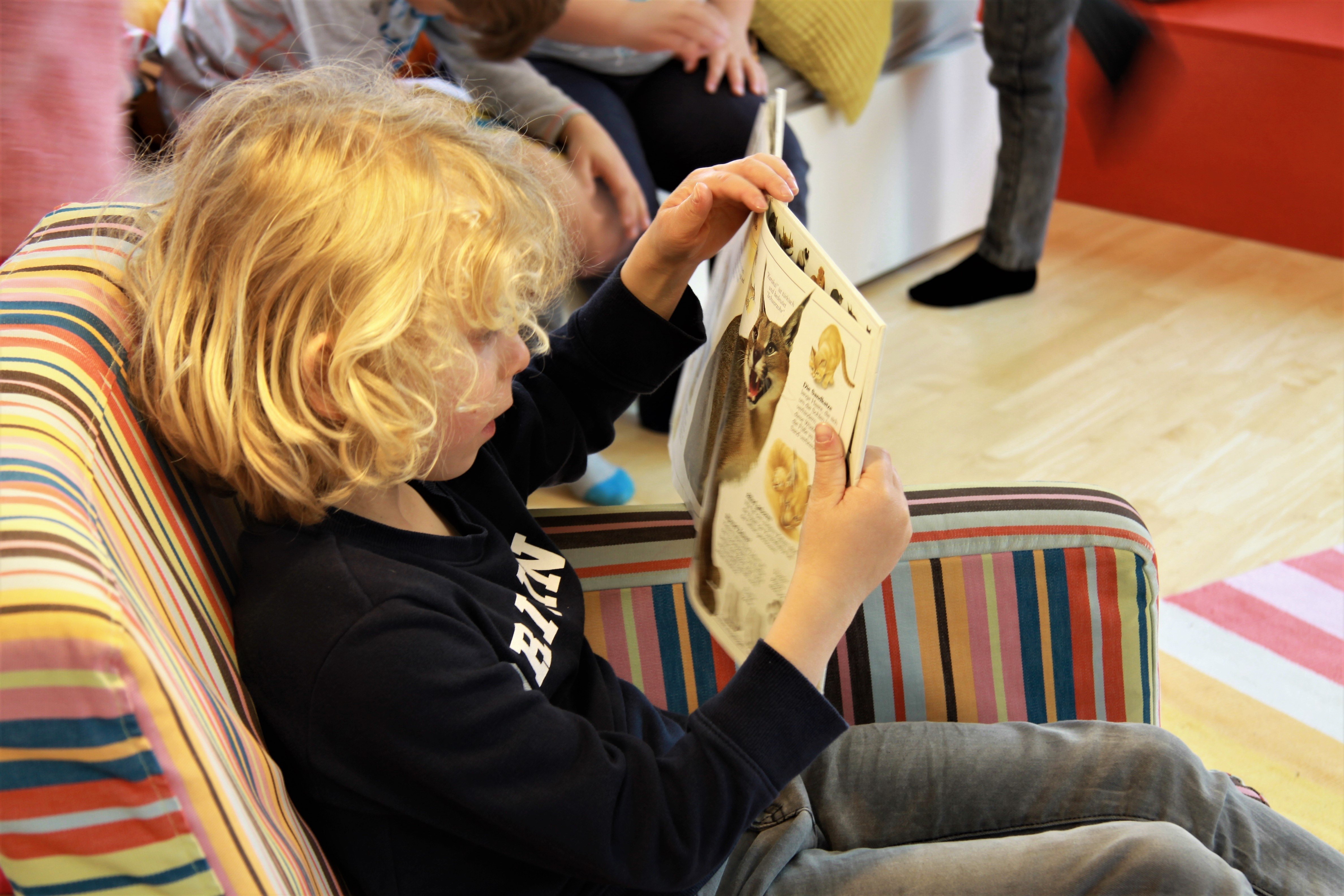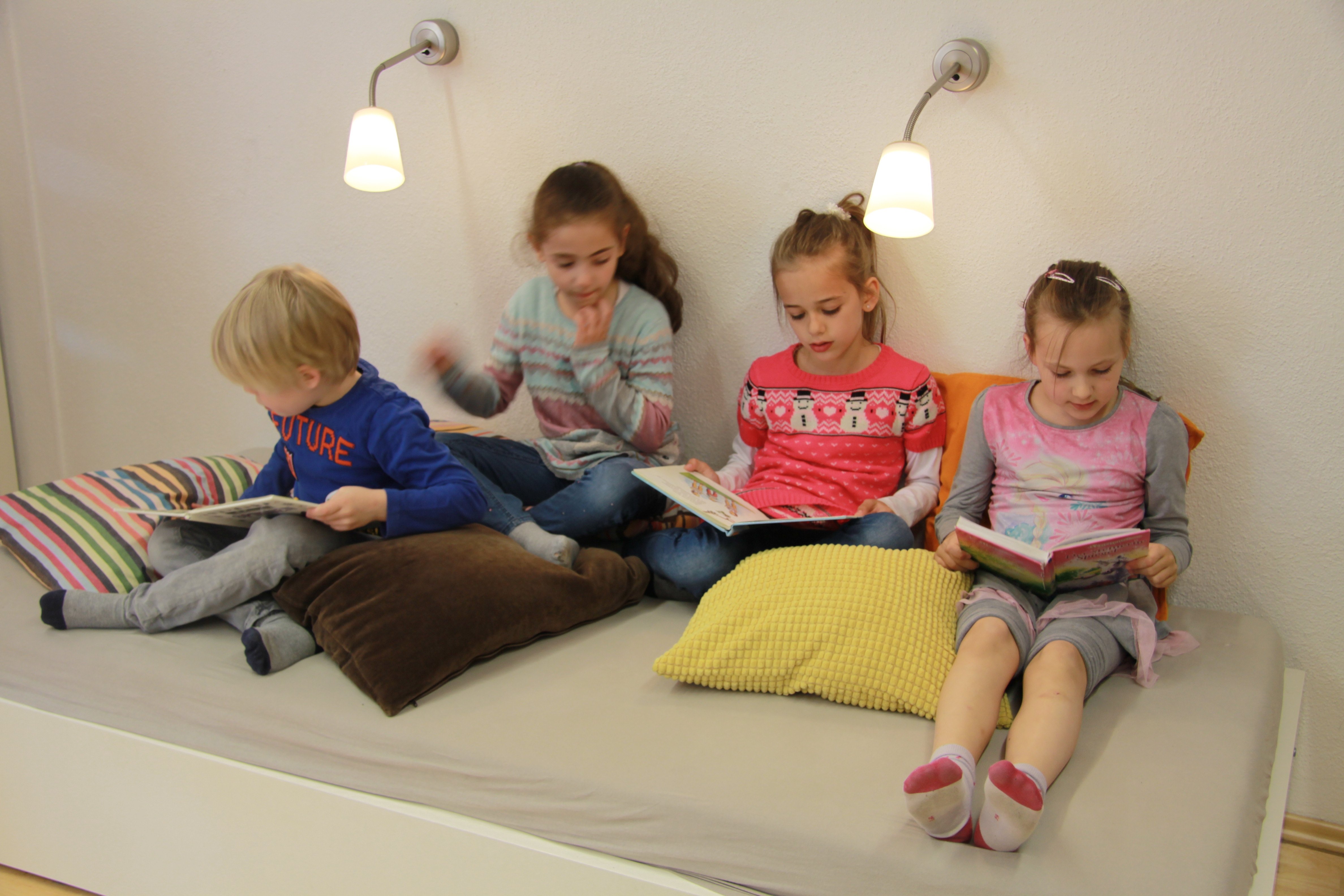 So gibt es genügend Rückzugsmöglichkeiten, um sich in aller Ruhe „seinem Lesestoff hinzugeben“ – sei es auf dem Teppich, im Sessel, auf dem Hochbett, auf der Bank, auf dem Bett oder eben am Tisch. Unser Lesezimmer ist mit vielfältigen Büchern bestückt, so dass jede Altersgruppe der Grundschule zu verschiedenen Themen etwas finden kann.
